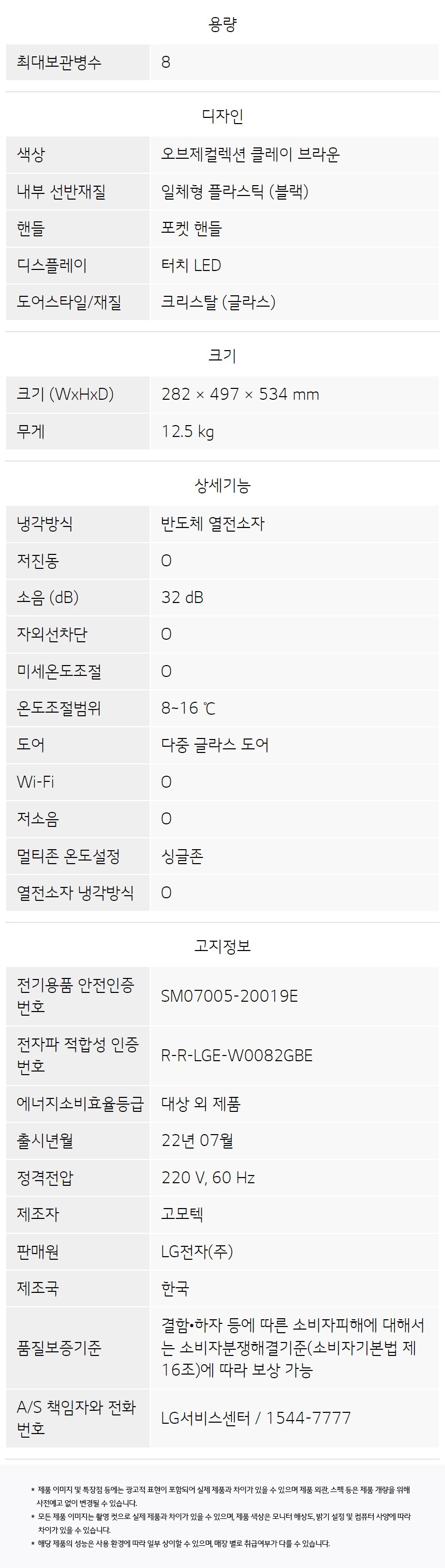 • [LG] 디오스 오브제컬렉션 와인셀러 최대8병보관 클레이브라운 W0082GCB